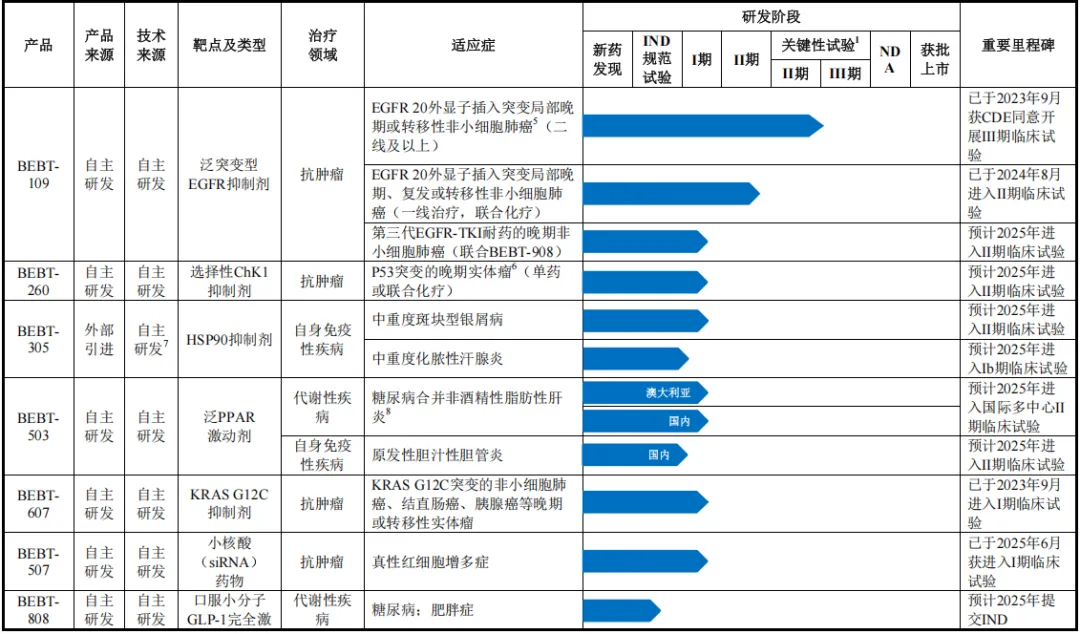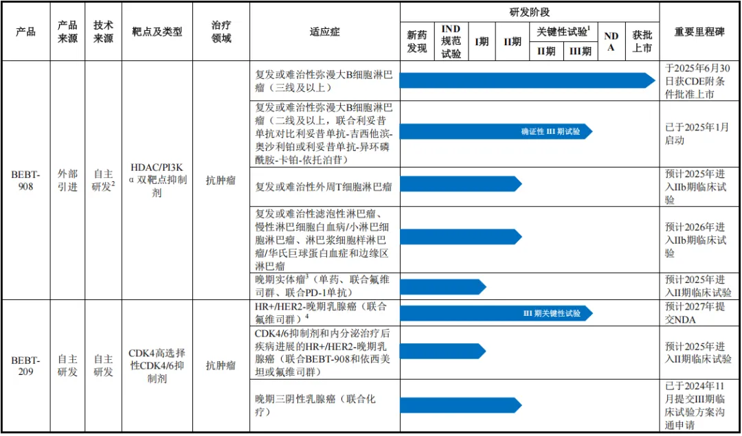 必贝特医药的核心产品BEBT-908,作为全球首个获批上市的小分子双靶点抑制剂,已于2025年6月30日获国家药品监督管理局(CDE)附条件批准上市,用于三线及以上治疗复发或难治性弥漫性大B细胞淋巴瘤(r/r DLBCL),目前公司已在积极推进该产品的商业化工作。除BEBT-908外,公司研发管线中BEBT-209处于III期临床试验阶段,BEBT-109已获准开展III期临床试验,5个产品处于I期临床试验阶段。
