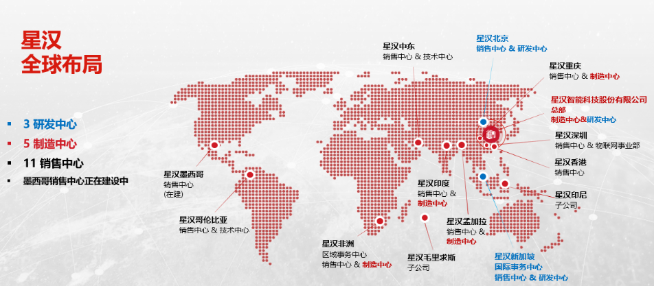 星汉智能科技股份有限公司成立于2011年,座落于珠海保税区。目前在香港、新加坡、迪拜、印度尼西亚设立了研发及数据中心,又相继在南非、印度、孟加拉成立了制造中心,在国家“一带一路”的引领下,成为广东省“走出去”的代表型企业。